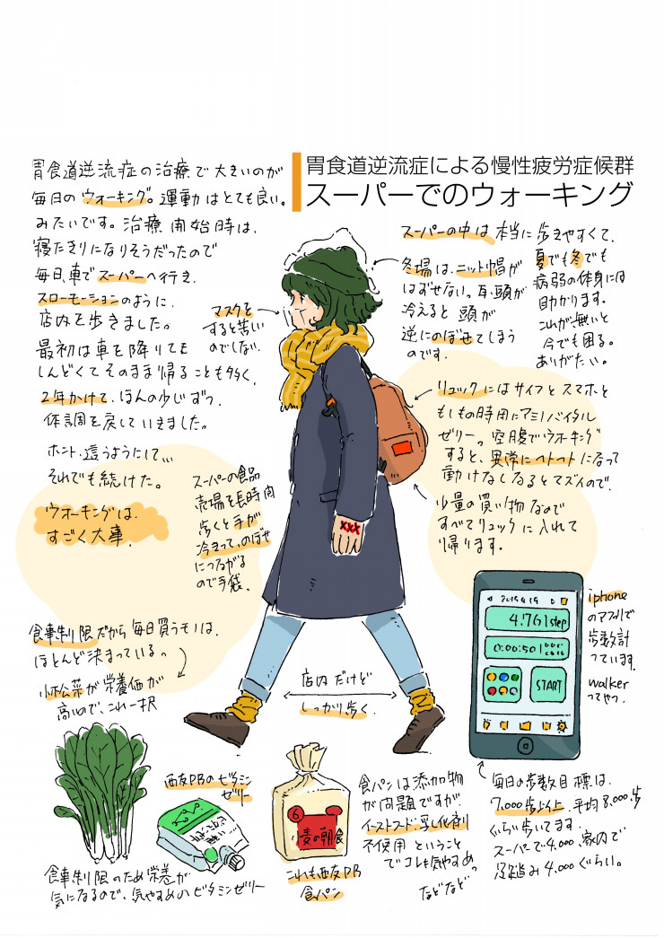 広告 慢性疲労症候群に効いた治療法・ウォーキング / イラストエッセイ 2020/11/16 2020/11/17 イラストエッセイ ※アフィリエイト広告を利用しています 慢性疲労症候群に効いた治療法・ウォーキング / イラストエッセイです。 胃食道逆流症による慢性疲労症候群の治療で、これは効いた!というもののひとつがウォーキングです。当時動けなくなってましたが、翌日からほぼ毎日今日まで少しずつ歩いてきました。最初は部屋の中をうろつく程度ですが、何時間もやりました。それから這うようにして外へ歩きにいきました。