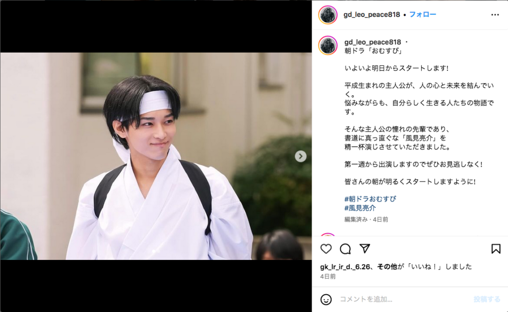 以上、NHK連続テレビ小説「おむすび」で書道部の先輩・風見亮介を演じる俳優の松本怜生さんの調べでした。